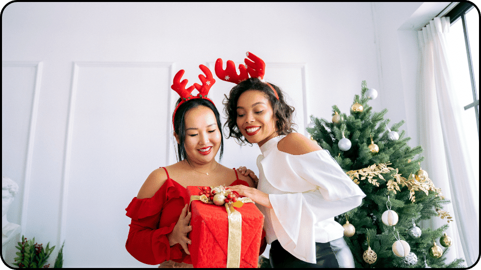 화려하게 꾸며진 크리스마스 트리 앞에서 머리띠를 강조하는 포즈를 취해 보세요. 머리띠와 트리 장식의 색감을 조화롭게 선택하면 사진의 완성도가 높아집니다. 다채로운 조명을 활용한 연출은 화려한 파티 분위기를 한껏 살려줍니다.