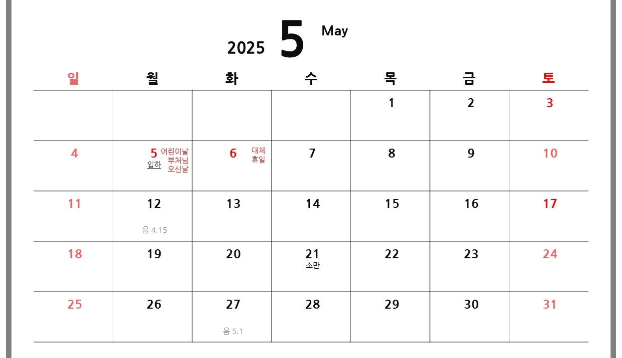 2025년 5월 달력에서 주요 공휴일은 어린이날이 있습니다. 어린이날은 5월 5일로, 많은 가정에서 자녀와 함께 즐거운 시간을 보내는 날입니다. 이 외에도 5월의 마지막 월요일은 대체휴일로 지정되어 있으며, 근로자의 날과 연결되어 많은 사람들이 긴 주말을 즐길 수 있습니다. 이처럼 2025년의 공휴일은 가족과 함께하는 소중한 시간을 제공하는 중요한 날들입니다.